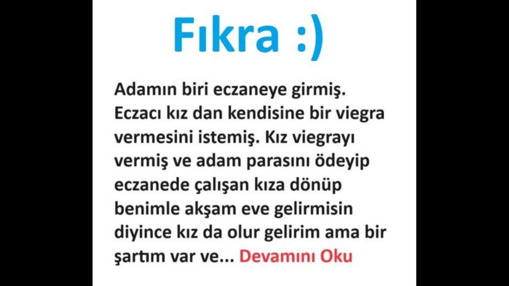 Adamın biri eczaneye girmiş. Eczacı kadından kendine bir via*gra vermesini istemiş. Kadın via*gra vermiş ve adam parasını ödeyip eczanede çalışan kıza dönüp benimle akşam eve gelir misin deyince, kız da olur ama bir şartım var. Seninle eve gelirim ama ver..