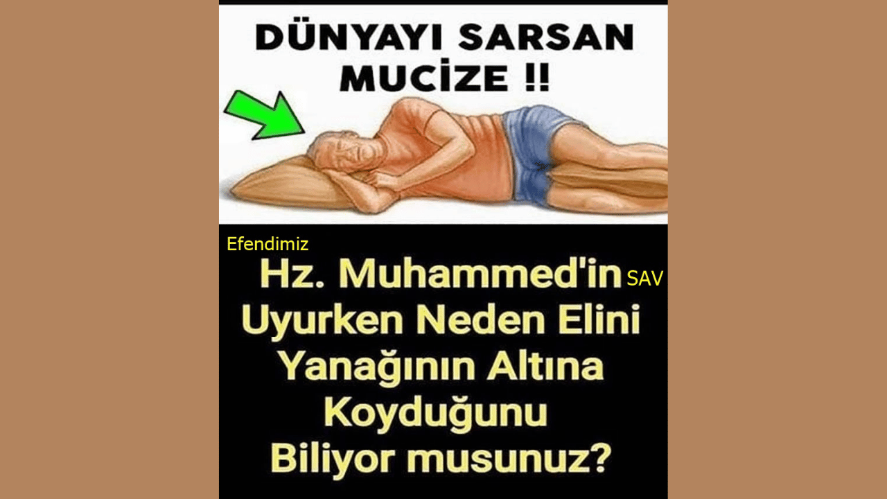 Bilimsel araştırmalar Peygamber efendimiz Hz. Muhammed (sav) bir uygulamasını daha ispatladı. Bilindiği üzere Peygamber efendimiz (sav) sünnetinde uyuma pozisyonu tanımlıdır. Hz. Muhammed (sav) çeşitli hadis kaynaklarında da belirtildiği üzere sağ tarafı üzerine yatarak dinlenirdi.